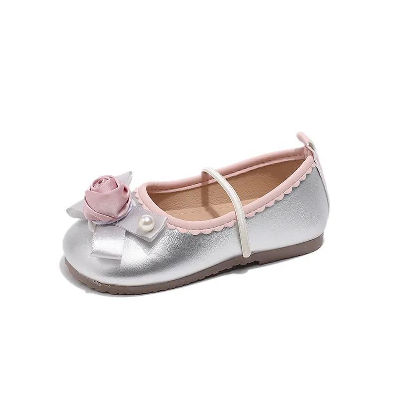 2024 Детские кожаные туфли для девочек Осень Новая мода и удобные Мягкие удобные Милые принцессы Корейский стиль Шикарные балетки 23 серебряный
