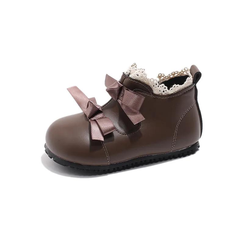 2024 Детские модные короткие ботинки для девочек осень-зима новые корейские стильные милые бабочки мягкие на подошве универсальные шикарные кожаные туфли 22 коричневый