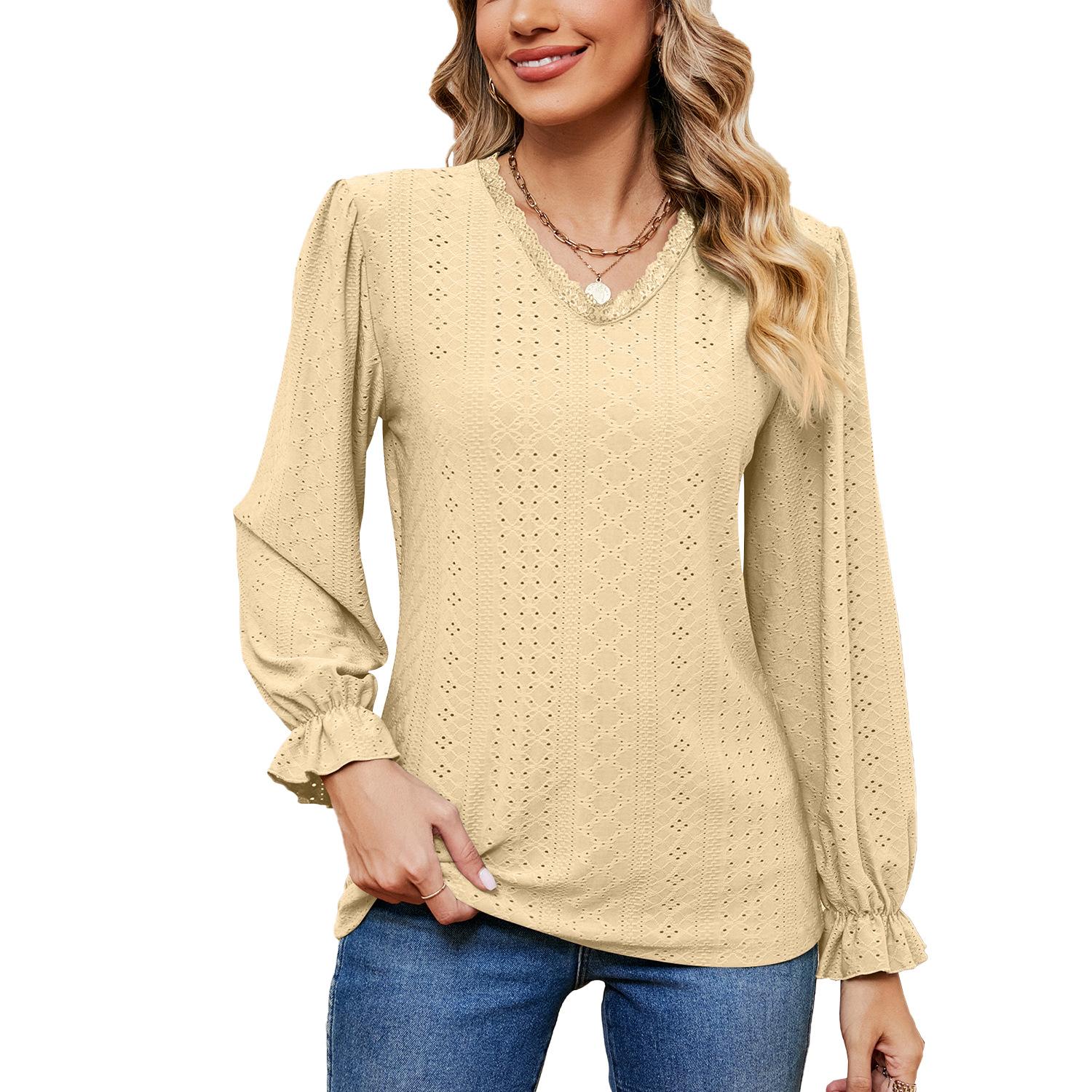 2024 Европейская и Американская осень и зима Новая кружевная V-образная горловина однотонная свободная футболка с длинными рукавами для женщин S жёлтый