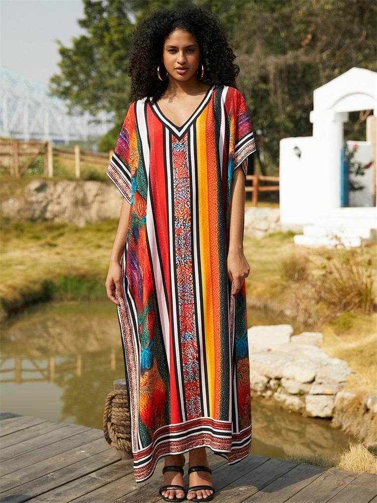 2024 Женский свободный кафтан Лето с многоцветным принтом и рукавами «летучая мышь» с V-образным вырезом Пляжное платье больших размеров Сексуальная пляжная одежда Купальник Прикрытие Домашние платья Q1658 One size разноцветный