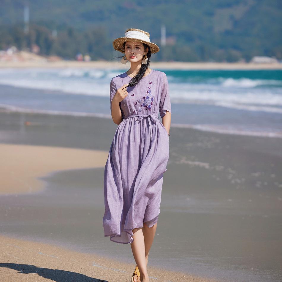 2024 Женское вышитое платье из рами свободного кроя - Рукав средней длины, Круглый вырез, Длинная завязка, Литературный стиль Large