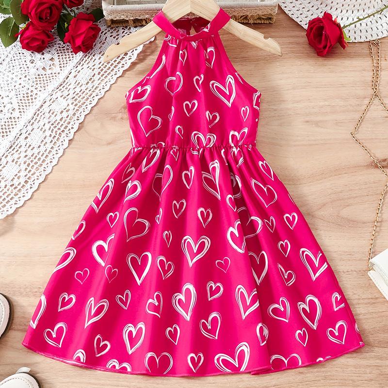 2024 Летнее платье для девочек с розовым узором «Любовь» и милой юбкой-трапецией на подтяжках Детская одежда 7Y розовый