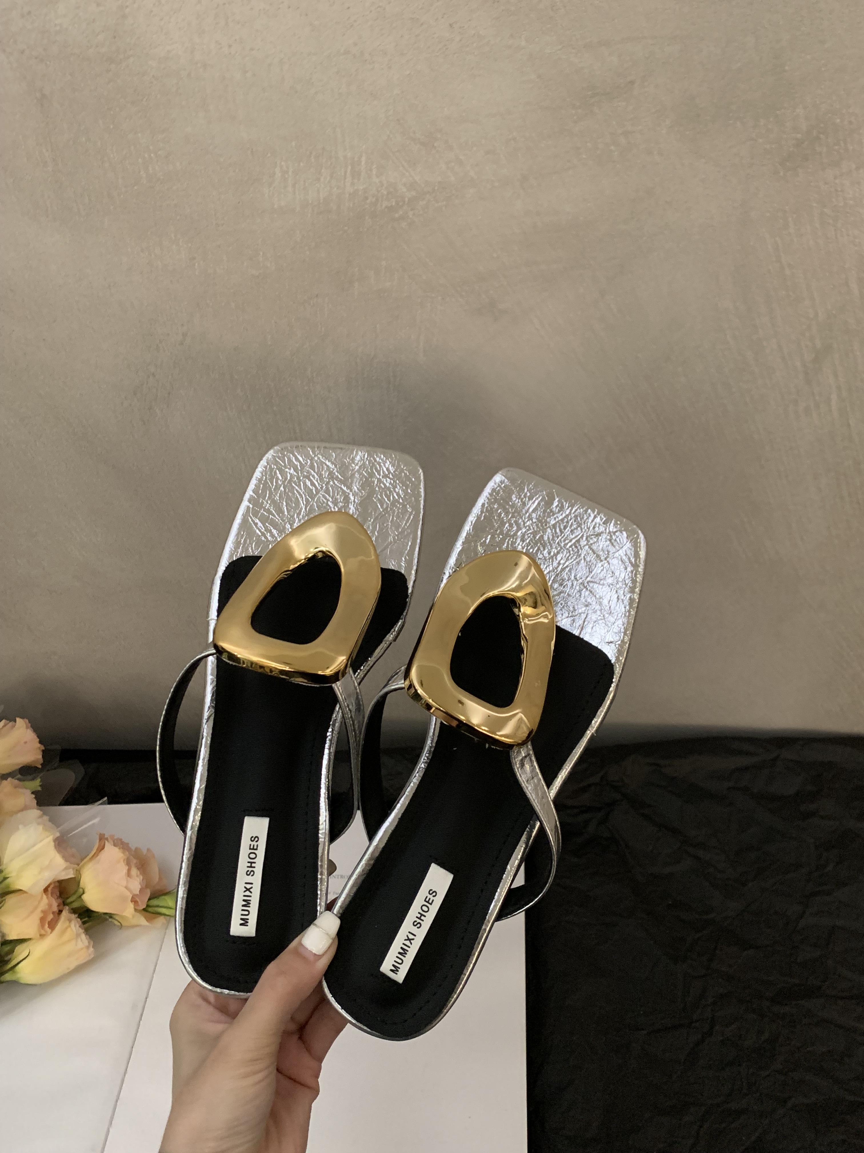 2024 2024 Металлическая обувь Винно-красные женские тапочки Шлепанцы Летние пляжные роскошные женские туфли на плоской подошве Сандалии Женские шлепанцы Тапочки 39 серебряный
