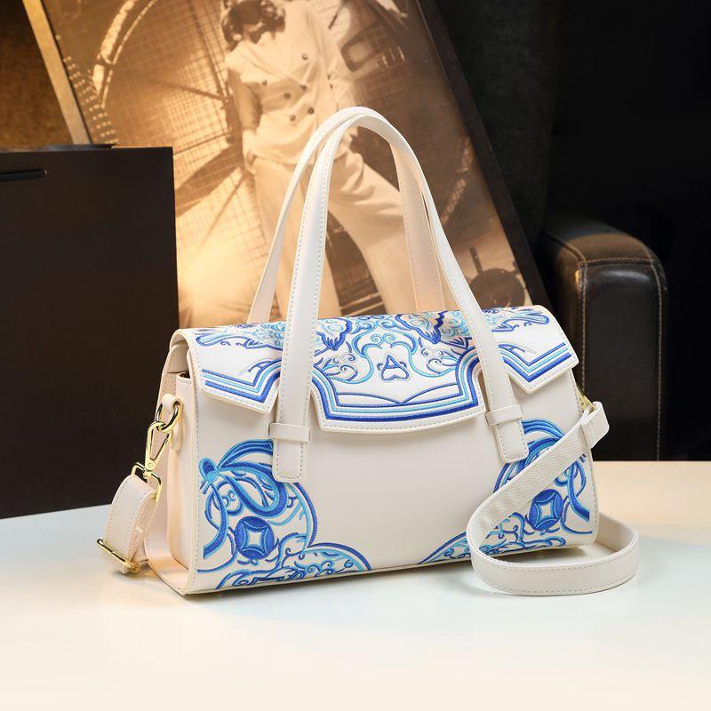 2024 Новая Модная Женская Сумка из Натуральной Кожи Новая Вышитая Сумка в Китайском Стиле Легкая Роскошь На Плечо Мессенджер Бостон небесно-голубой