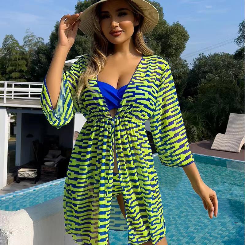 2024 Новая женская длинная рубашка с разрезом, пляжный купальник, европейская и американская внешняя торговля, новый купальник-бикини, комплект из трех предметов XL синий