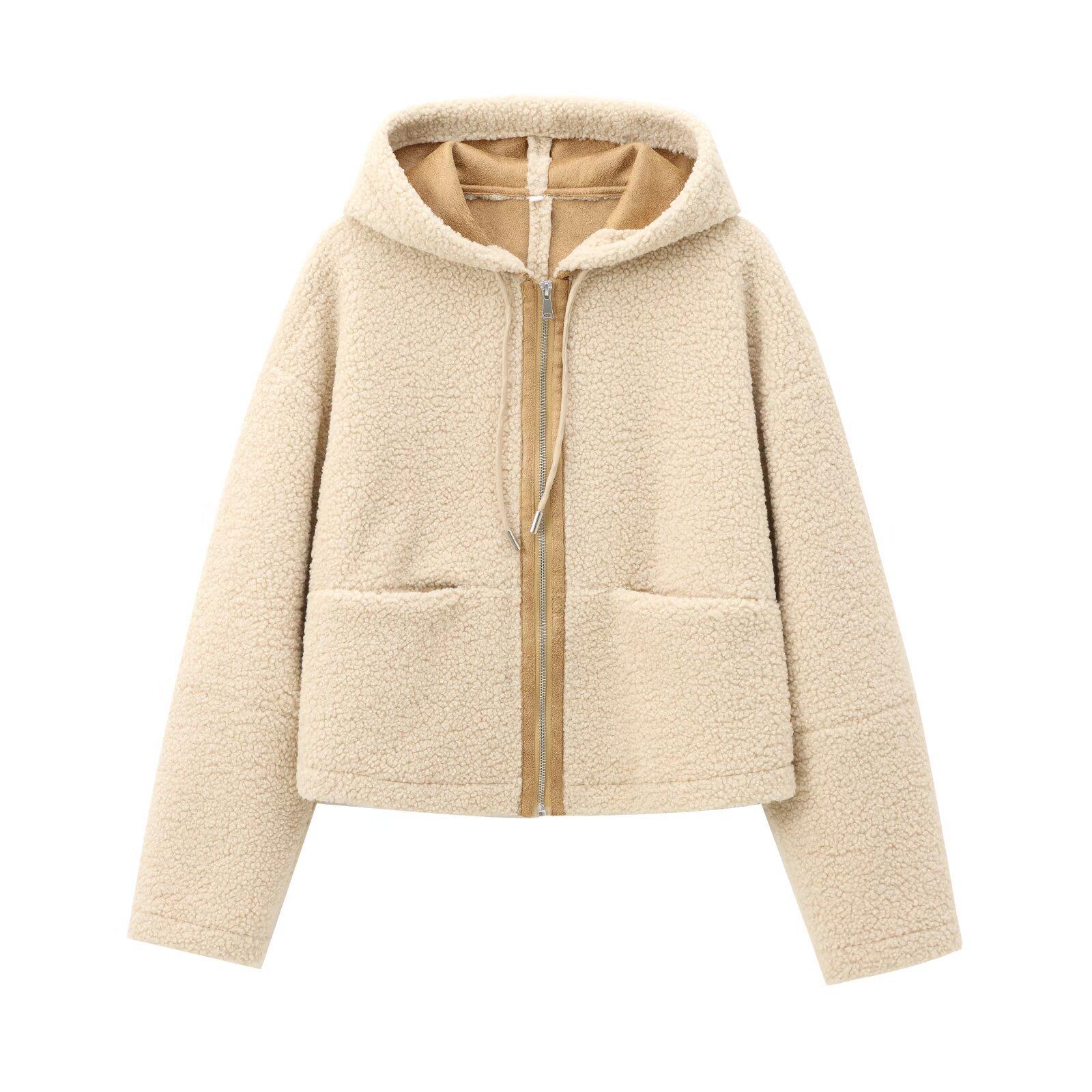 2024 Осень Женская Куртка в Европейском и Американском Стиле, Нежная Флисовая с Капюшоном, с Длинным Рукавом Extra Small бежевый