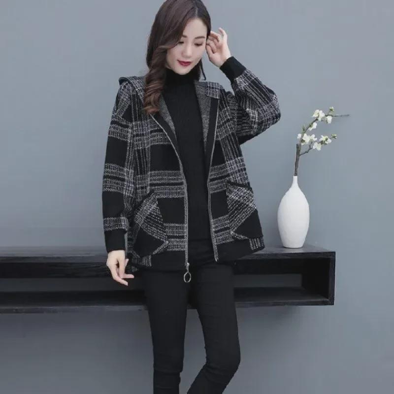 2024 Осень/Зима Корейский Стиль Клетчатая Куртка Для Женщин - Модная, Маленькая, Свободного Покроя, Средней Длины XL чёрный