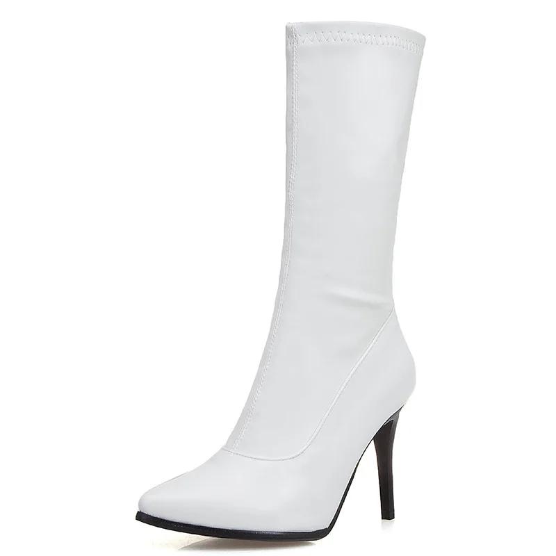 2024 Осень/Зима Новые Ботильоны Большого Размера Высокие Каблуки Острый Носок Модные Эластичные Ботильоны Большой Размер 34-43 34 белый