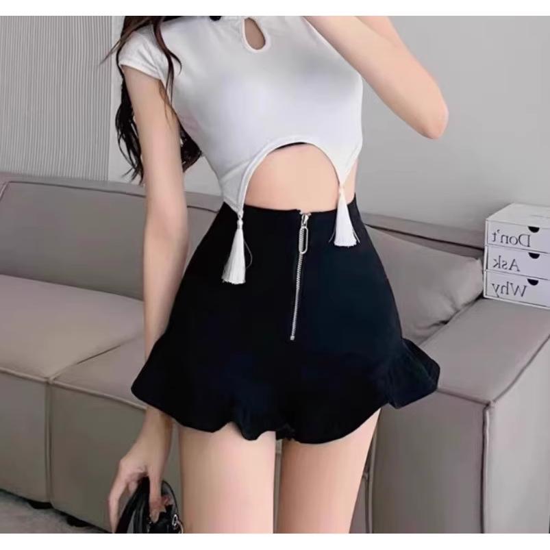 2024 Осень Шорты с высокой талией, черные, с оборками, для женщин 4XL чёрный