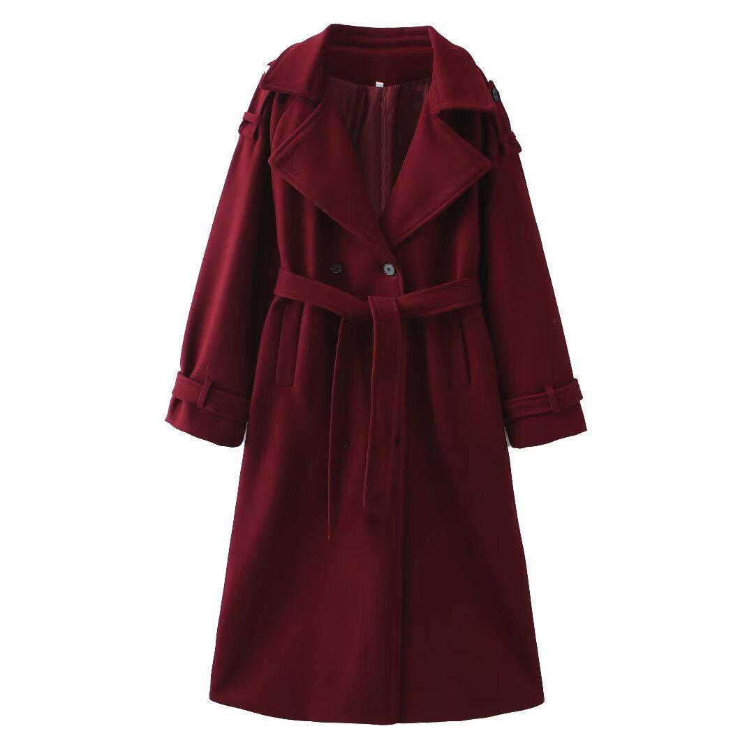 2024 Пальто женское шерстяное в европейском и американском стиле с поясом - Модное, простое и универсальное пальто с отложным воротником L темно-красного