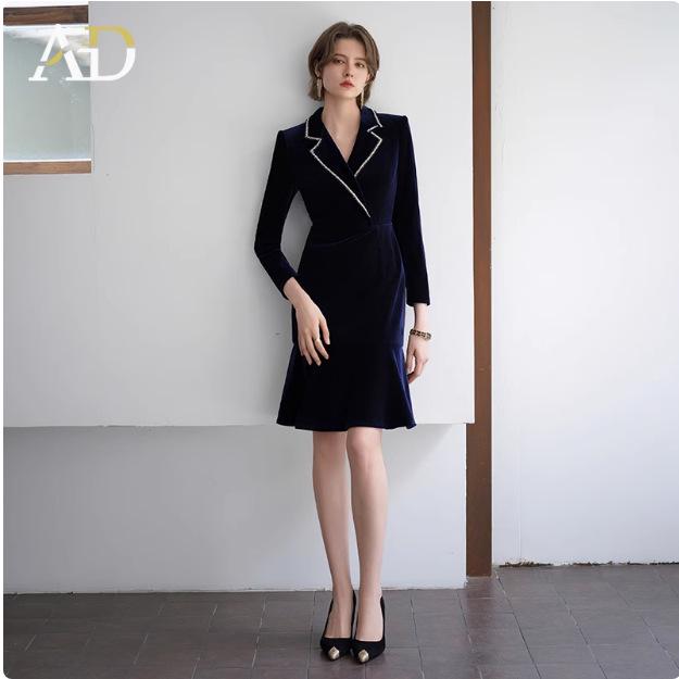 2024 Ранняя осень Темно-синее бархатное женское формальное платье с оборками и длинными рукавами XL