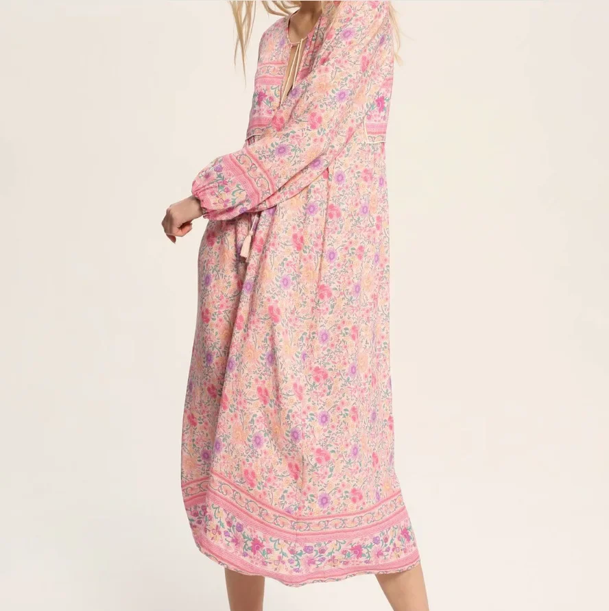 2024 женские платья с длинным рукавом и цветочным принтом в стиле ретро с V-образным вырезом и кисточками в богемном стиле
