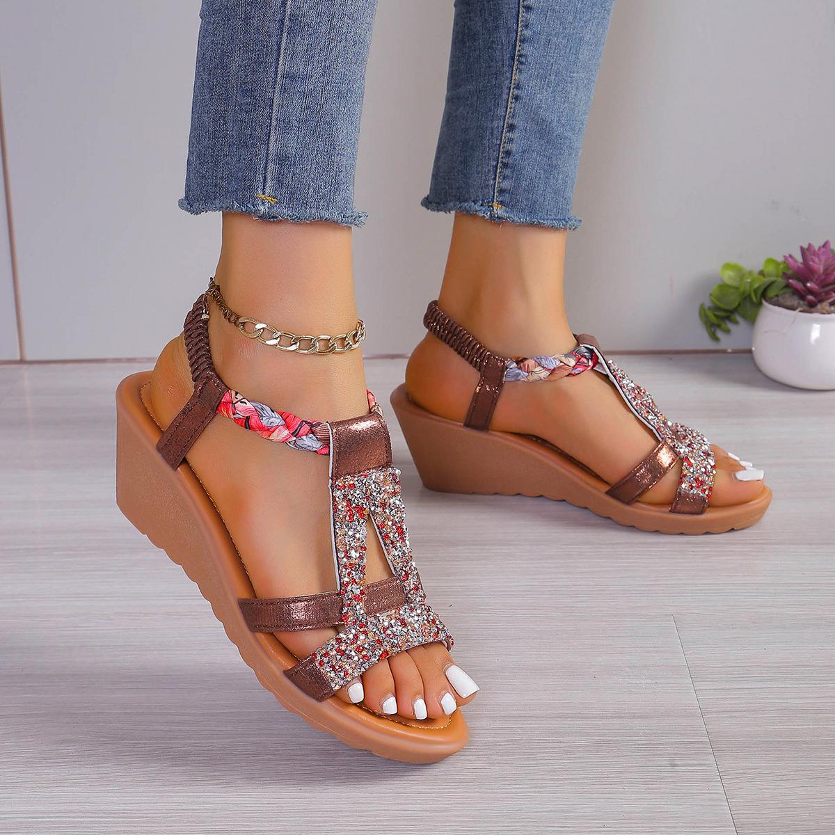 2024 летние бохо новые сандалии с толстой подошвой и стразами женские босоножки с ремешком на щиколотке импортные римские сандалии большого размера пятно 43 темно-коричневого