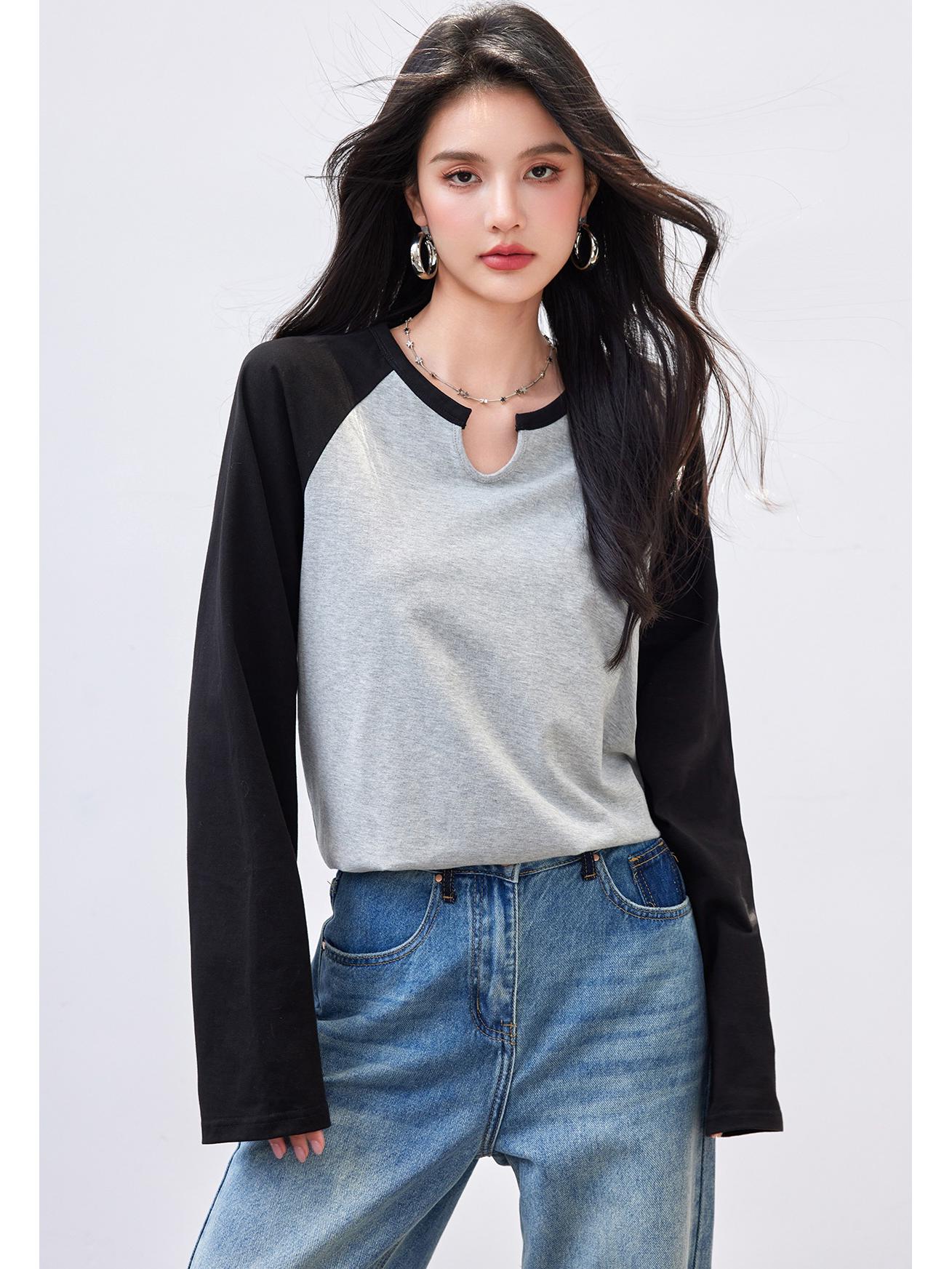 2025 Весна Ретро Черно-белый Колорблок Женская Повседневная Футболка с Длинным Рукавом Extra Large чёрный/серый
