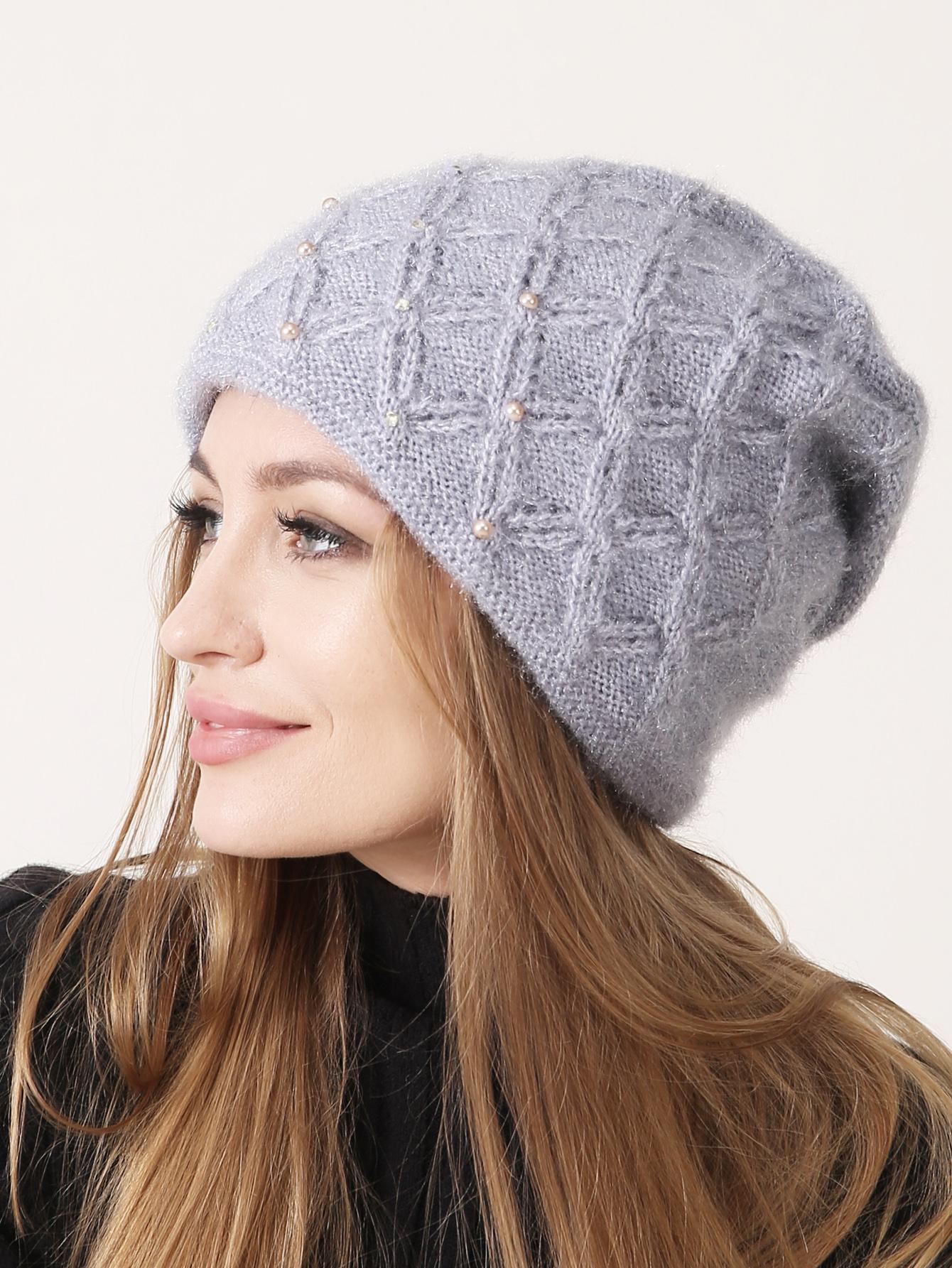 2025 Вязаные шапки для женщин зимние теплые жемчужные шапки черепа уличная толстая шапка синий