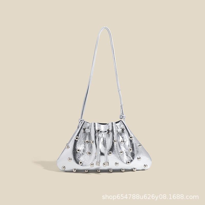 2025 Женская сумка-ведро с заклепками подмышкой: Стильная, универсальная и портативная сумка через плечо с завязкой серебряный