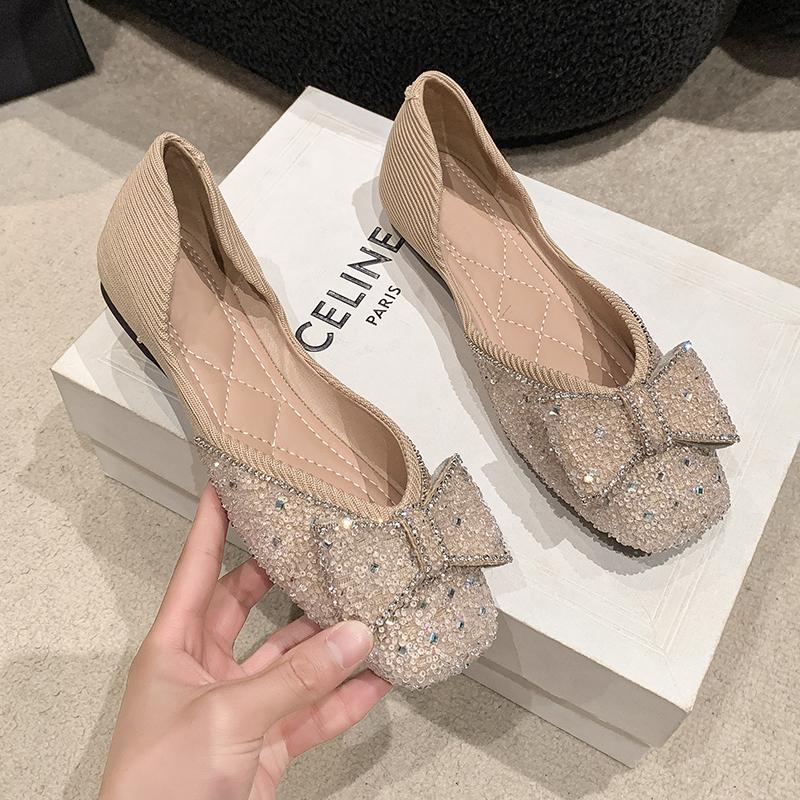 2025 Женские туфли-лодочки на низком каблуке 1 см, милые свадебные балетки, женские блестящие туфли с полными пайетками, жемчужным бантом, на низком каблуке, женская модная хрустальная обувь для Дня святого Валентина 40 бежевый