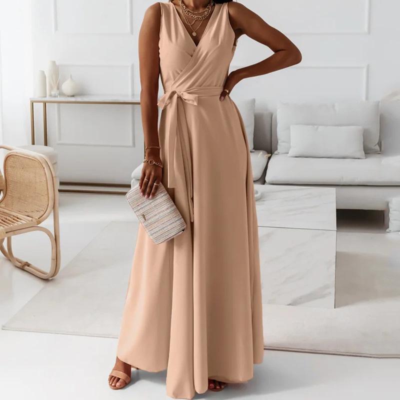 2025 Летнее Вечернее Длинное Платье на Шнуровке Однотонное с V-образным Вырезом Medium хаки