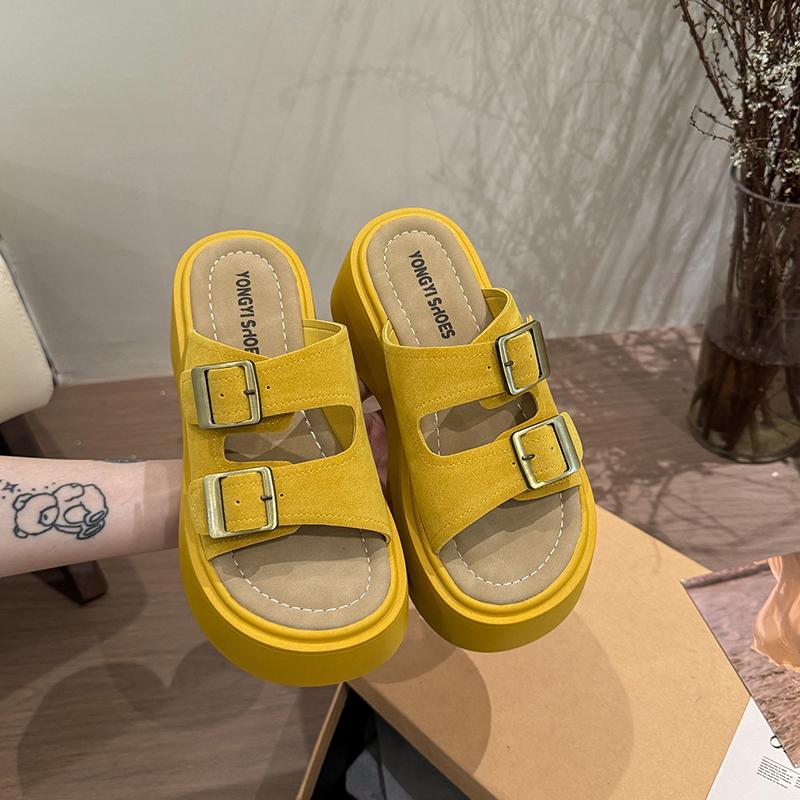 2025 Новые летние лаконичные женские тапочки с открытым носком, модные туфли на плоской платформе, пляжное платье, женские шлепанцы 35 жёлтый