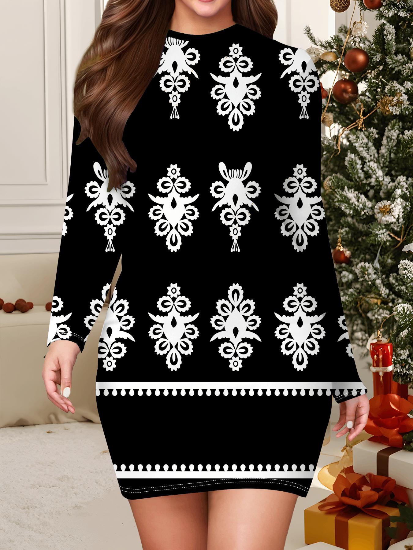 2025 Осень и Зима Новое Женское Платье в Облипку, 3D Ретро Принт и Окрашивание Женская Мода Платье с Длинным Рукавом и Круглым Вырезом Сексуальное Платье в Облипку XXL чёрный