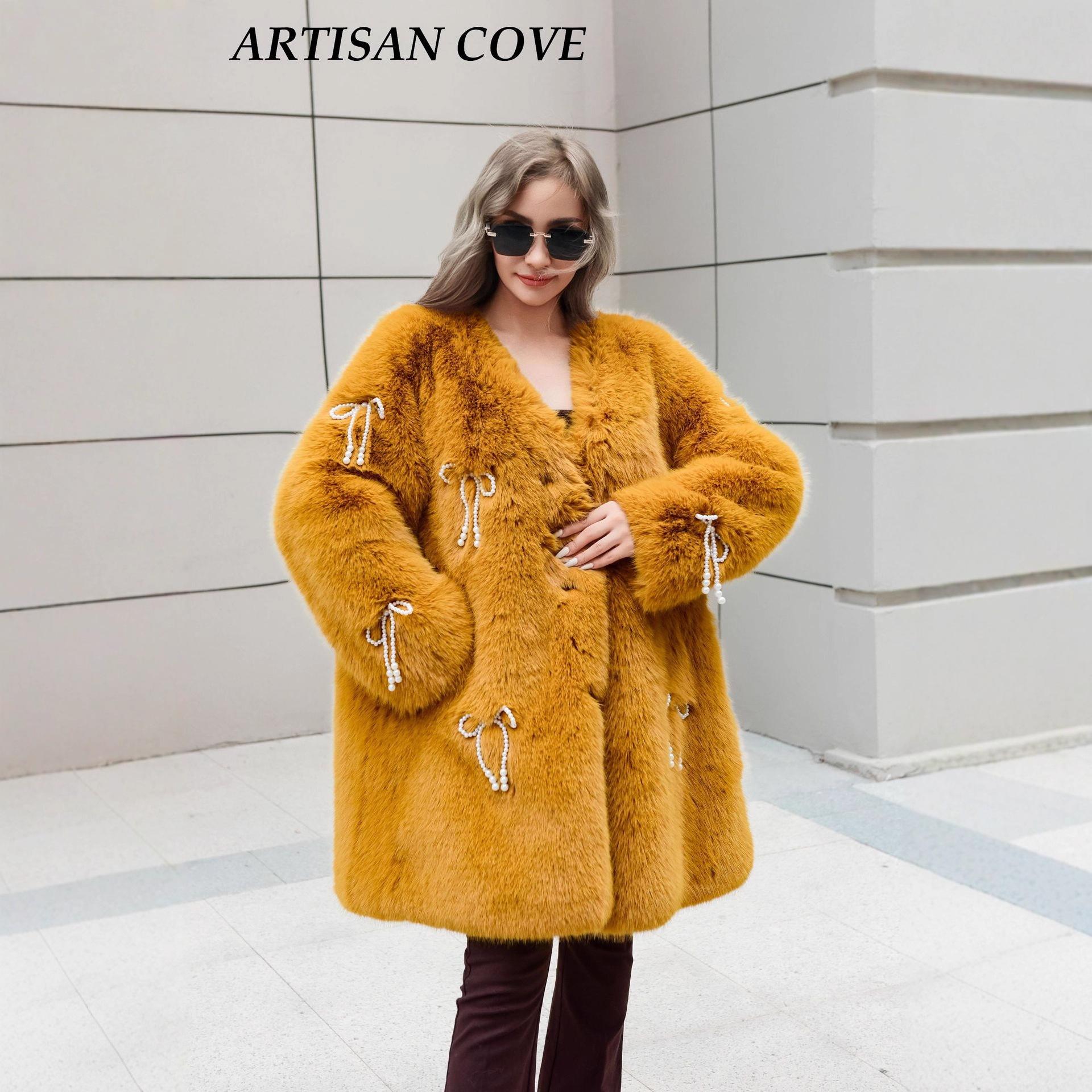 2025 Осень/зима Новое женское пальто из искусственного меха с V-образным вырезом one size fits all оранжевый