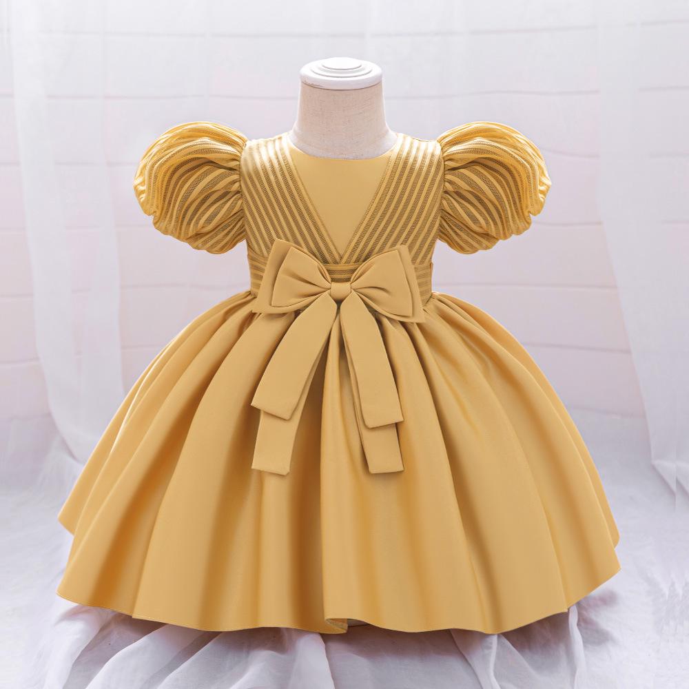 2025 Платье принцессы на первый день рождения для младенца девочки - Атласное платье с пышными рукавами и полосатым дизайном с бантом 80cm/9-12M золотой