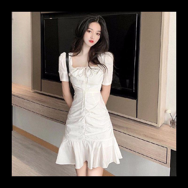 2025 Французское Сказочное Плиссированное Платье с Квадратным Вырезом и Рюшами - Облегающий Крой, Короткая Юбка «Рыбий Хвост» Medium белый