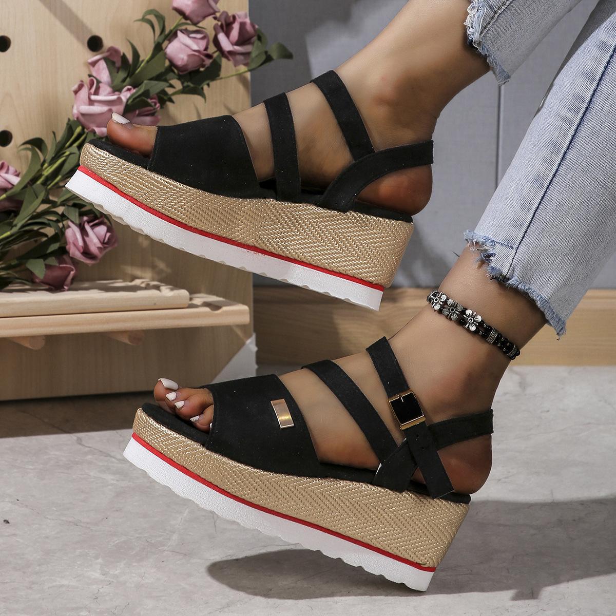2025 весна и лето новые босоножки на танкетке с заостренным носком женские босоножки большого размера на платформе с пряжкой в одно слово 36 чёрный
