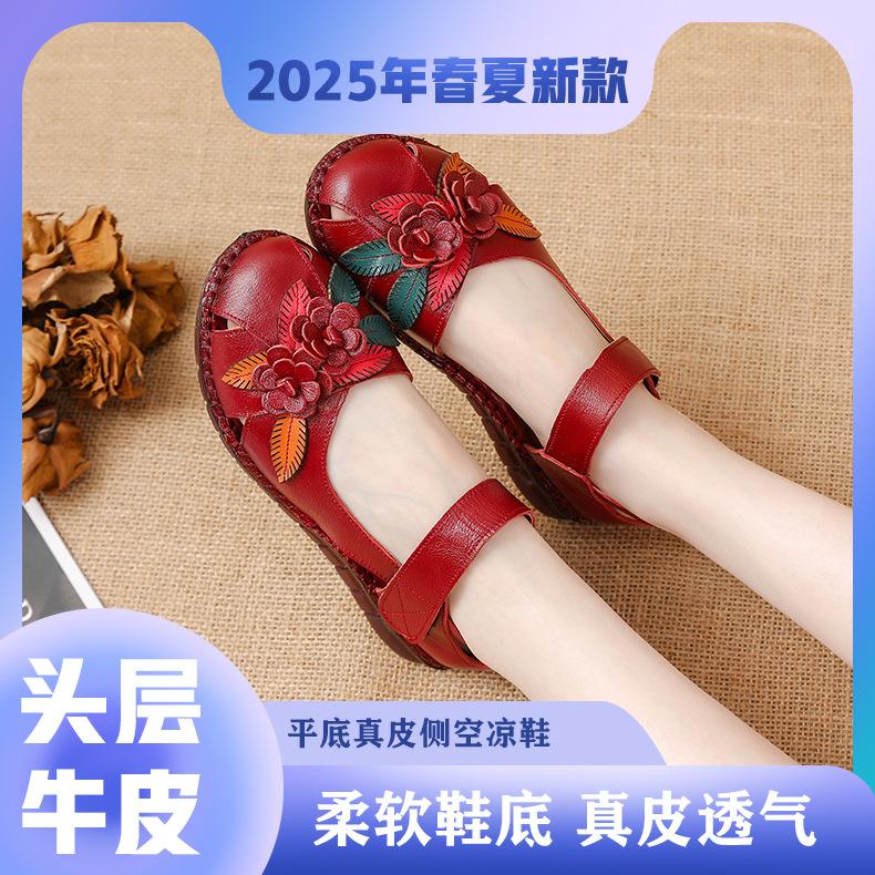 2025 женские сандалии на плоской подошве кожа подошва из говяжьей кожи боковая перфорация нескользящая мягкая подошва мягкая поверхность этнический стиль 42 красный