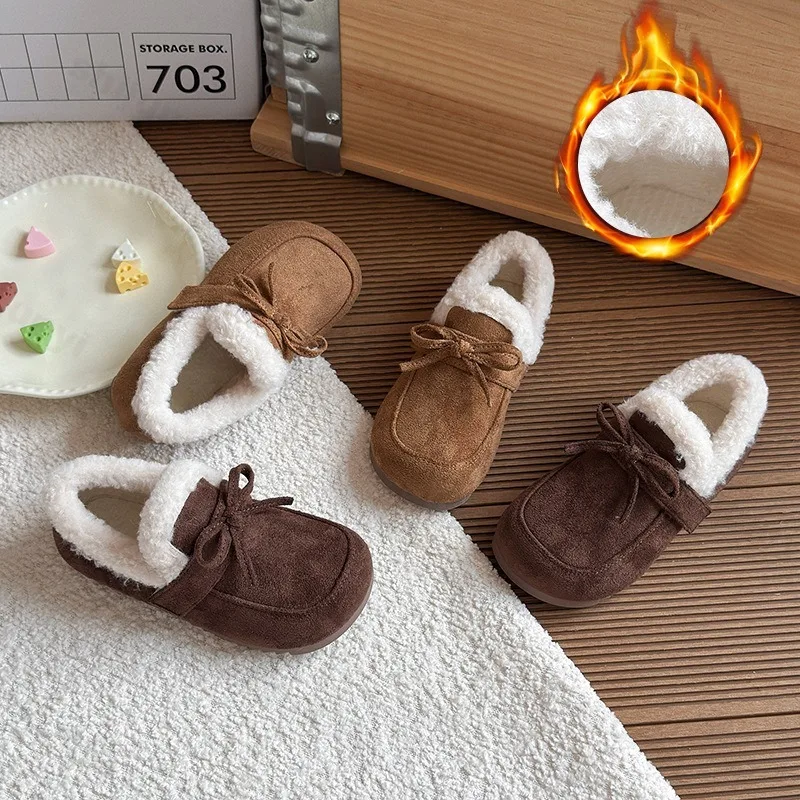 2025 зимняя теплая повседневная обувь с бантом в стиле ретро для девочек с низким берцем, детская универсальная удобная плюшевая обувь на мягкой подошве из хлопка