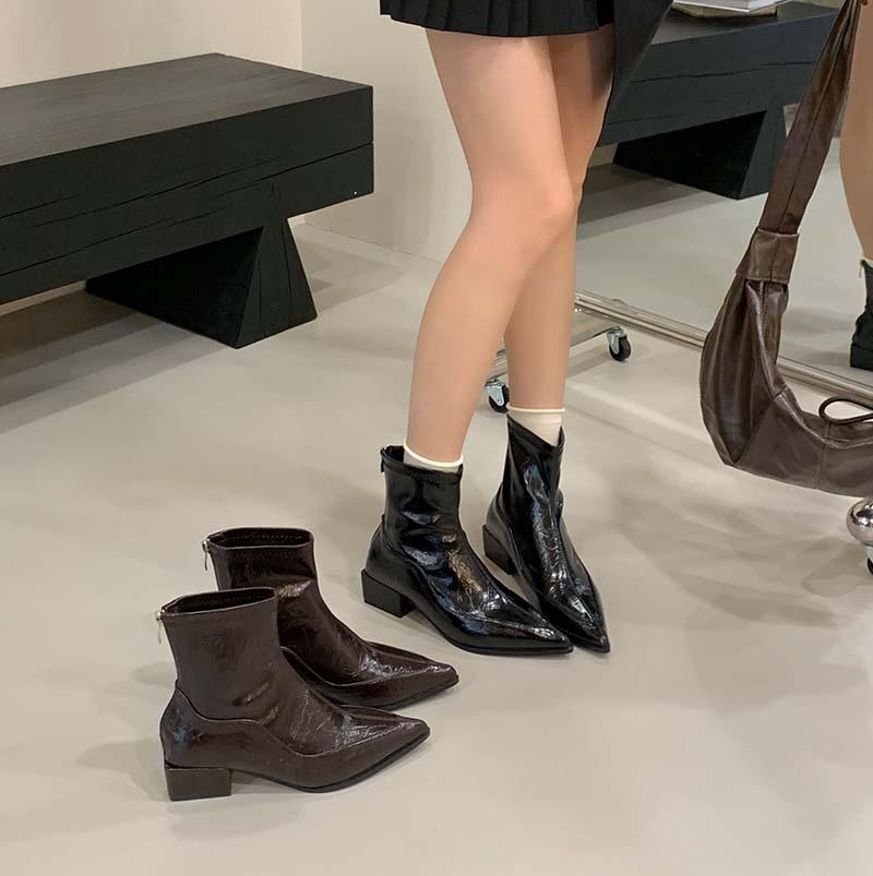 2025 осень и зима новая овчина острый носок эластичные ботильоны детские задняя молния короткие сапоги толстый каблук французская мода тонкие сапоги женские 40 коричневый