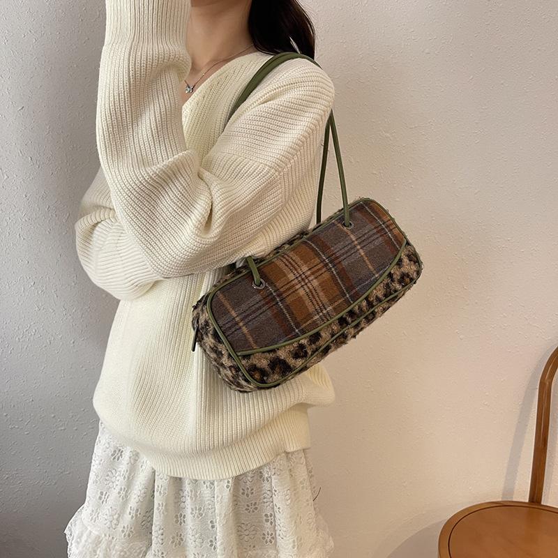 2025 осень и зима новая шерстяная ретро клетчатая сумка-багет плюшевая нишевая на одно плечо подмышечная сумка женская 30*9*13 кофейный