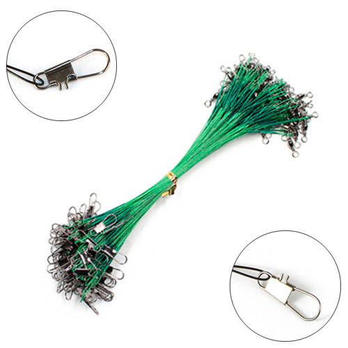 Комплект из 20 стальных рыболовных поводков, оснащенных вертлюжком и застежкой. Используются для предотвращения перекусывания лески, перекручивания приманок, ловли хищной рыбы.Не запутываются, подходят для легкой и средней приманкиДлина поводка (без учета вертлюга и застежки): 30 смТолщина проволоки: 0.5 ммЦвет: зеленыйМатериал: стальная проволока