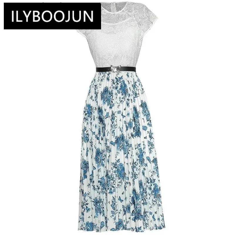 ILYBOOJUN Fashion Designer Summer Print Dress Women's O-Neck Short Sleeve Sashes Hollow out Patchwork High Street Pleated Dress