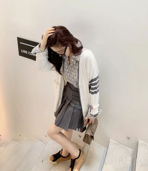 21 autumn and winter new tb four bar knitted women's casual loose stripe couple's wool cardigan coat men's sweater, White;black