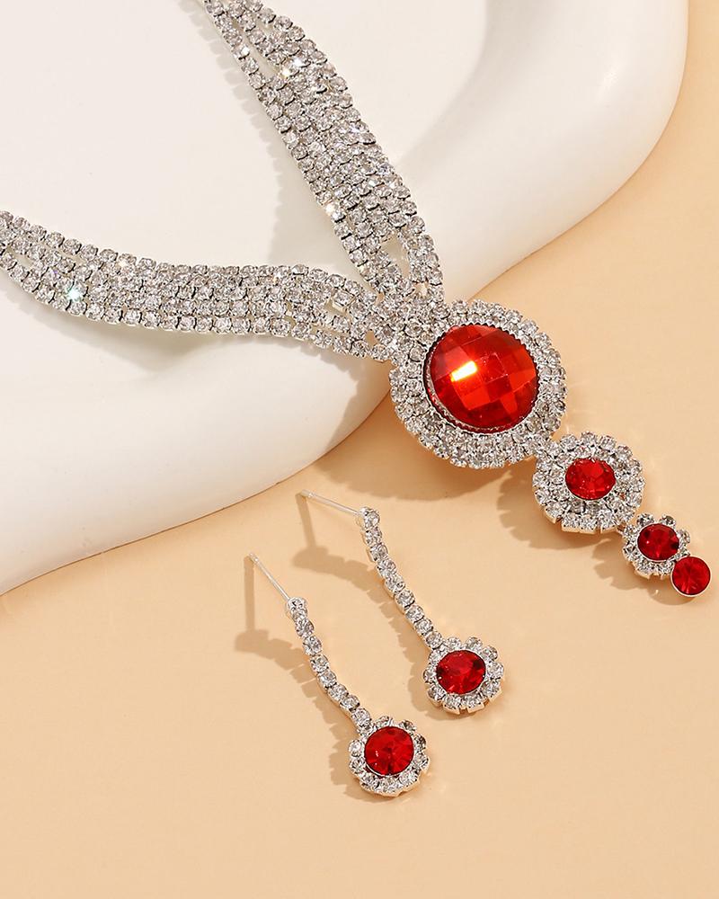 22PCS Rhinestone Geometric Pendant Necklace & Drop Earrings Evening Party Wedding Jewelry Set, Red
