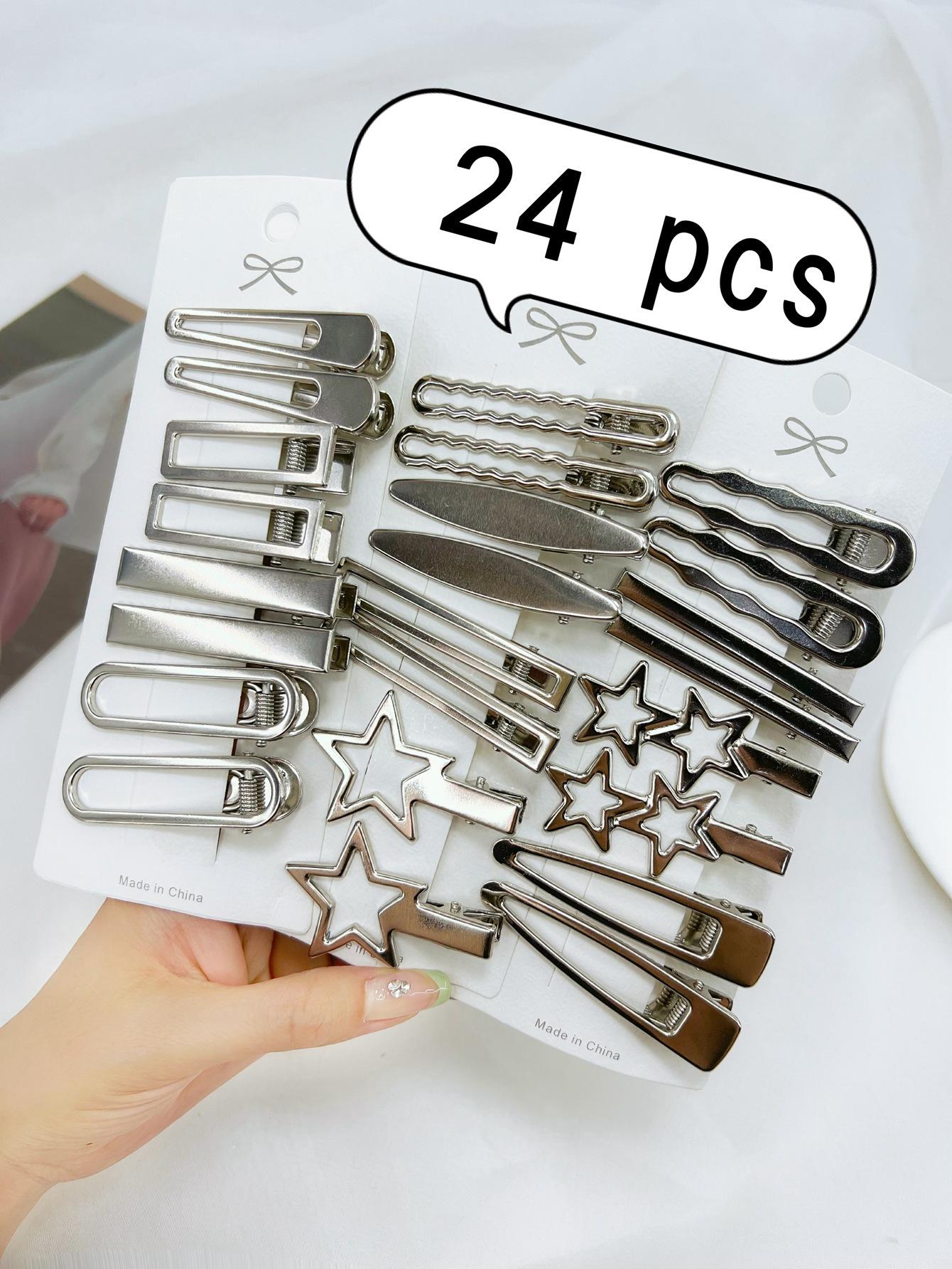 24 шт./компл. Y2K серебряные металлические шпильки для женщин и девочек, заколки для волос в форме звезды, несколько стилей, бесшовные заколки в форме утконоса, аксессуары для волос для девочек