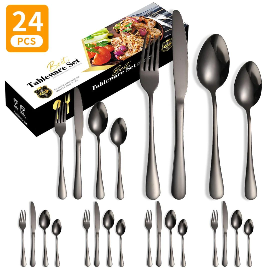 24 шт. набор ножей, вилок, ложек, стейков, западная еда, блестящая простая нержавеющая сталь, бамбуковая ручка, домашняя посуда
