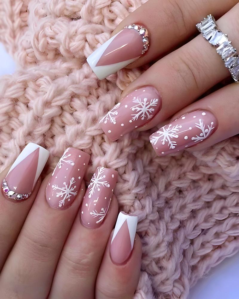 24pcs Christmas Rhinestone Decor Snowflake Design Press-on Coffin False Nails Set, Pink