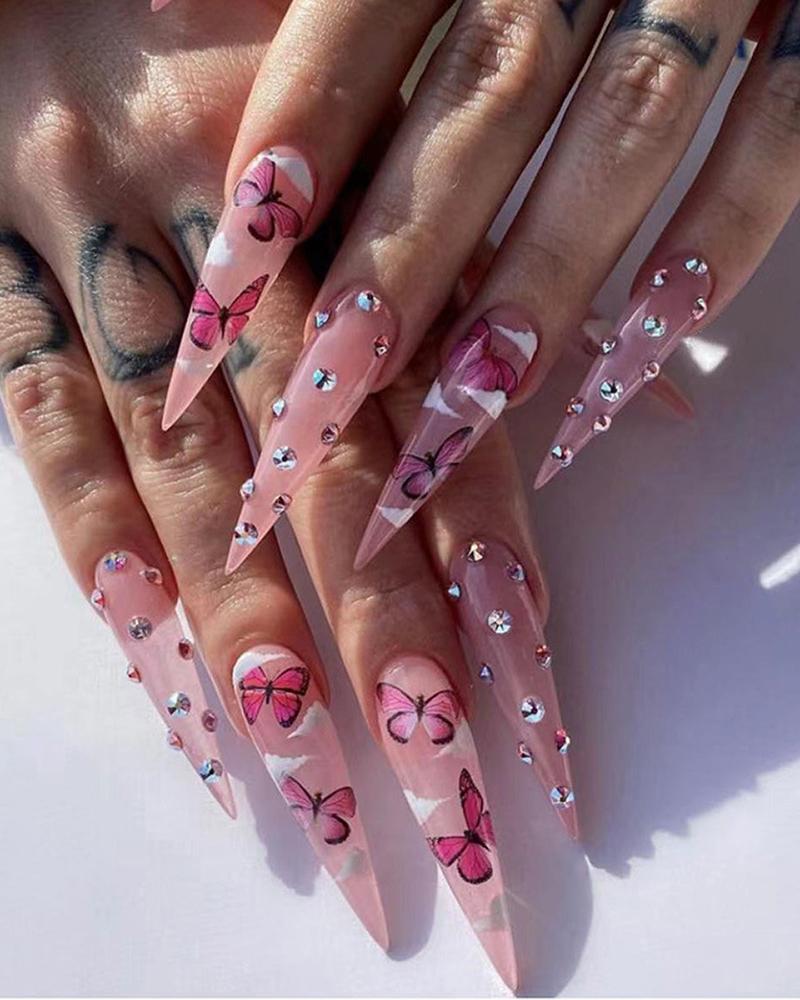 24pcs Extra Long Stiletto Press on Butterfly Clouds Rhinestone False Nails Set, Style1