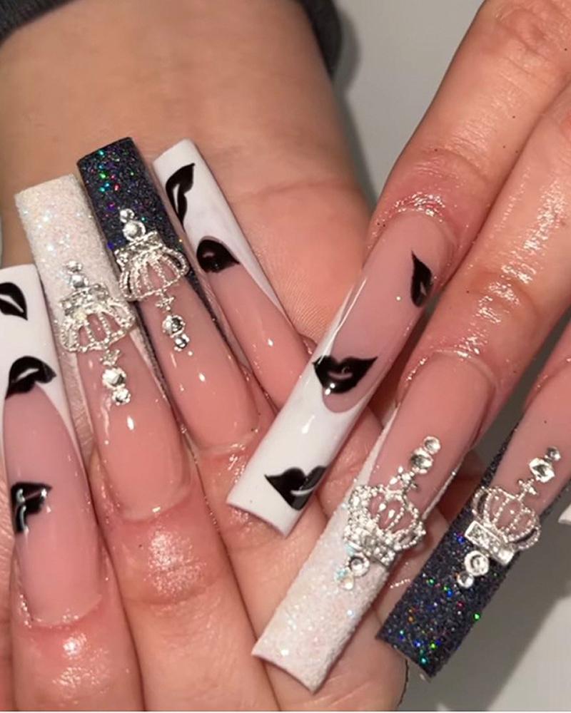 24pcs Lip Crown Glitter Rhinestone Coffin Long Press On False Nails Set, Style1