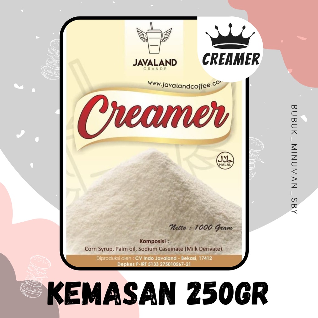 Krimer Javaland adalah produk pengganti susu atau krim yang merupakan produk emulsi lemak dalam air, dibuat dari minyak nabati yang dihidrogenasi dengan penambahan bahan tambahan pangan yang diizinkan. Bubuk Creamer / Krimer dari JAVALAND termurah dan terbaik. Tambahkan krimer pada minuman anda untuk rasa susu yang lebih pekat dan kental