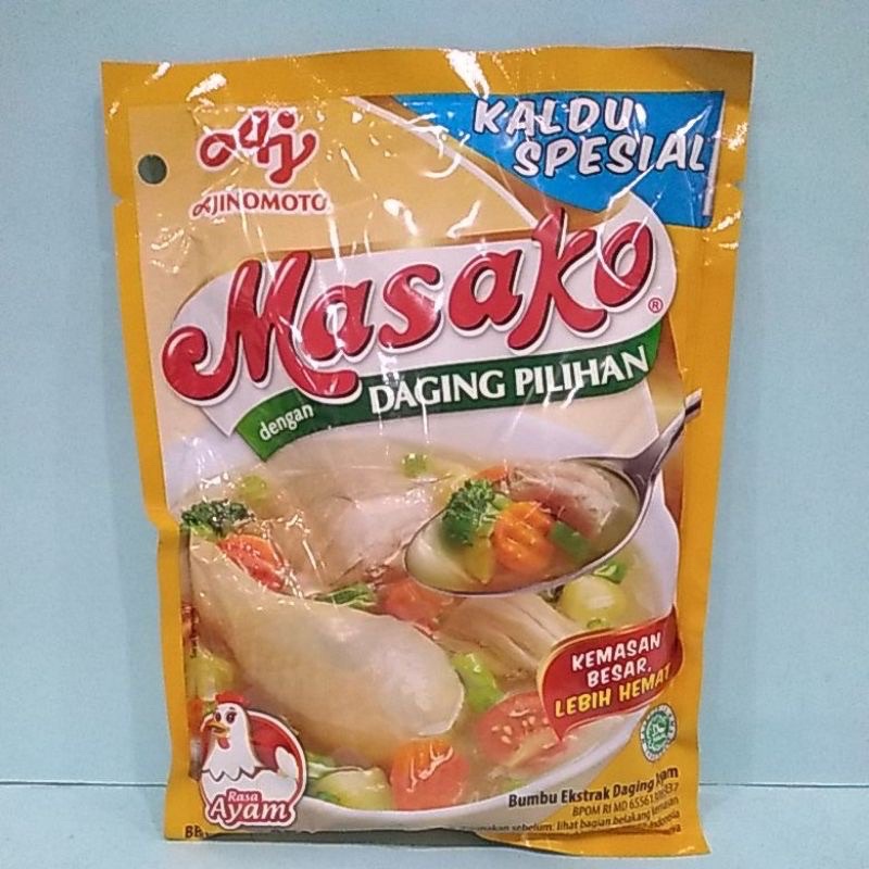 Masako Bumbu Penyedap Rasa Kaldu Ayam & Sapi merupakan bumbu ekstrak daging ayam & sapi yang dibuat dengan perpaduan tepat antara daging segar berkualitas, bumbu, dan rempah pilihan. Dapat memberikan rasa dan aroma masakan dari daging asli sama seperti kaldu buatan sendiri.