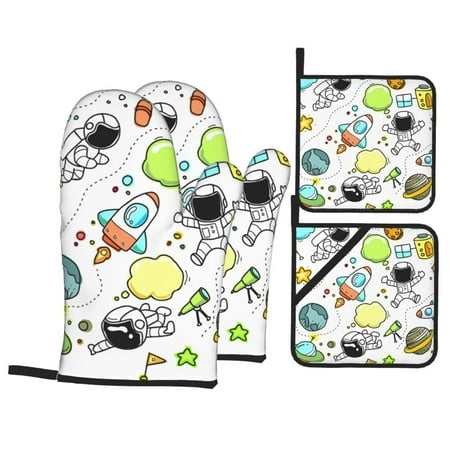 Oven Mitts and Pot Holders Set Baking 4-Piece Set for Kitchen for Outdoor BBQ Mitts Heat Resistant Cooking Space Graffiti Pattern