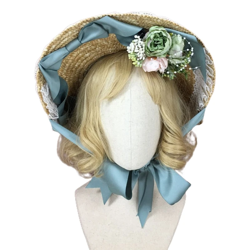 Лолита ручной работы соломенная шляпа от солнца ручной работы Цветочные Винтаж Чай вечерние для пляжа; Летние туфли на плоской подошве Кепк...