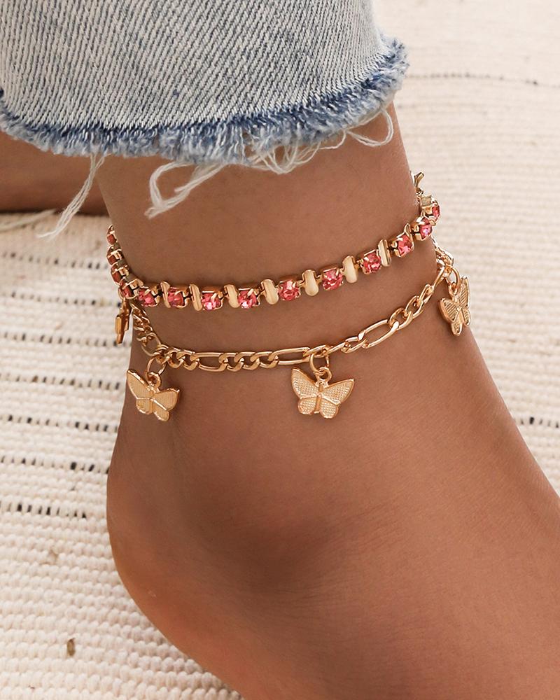 2PC Butterfly Pattern Rhinestone Anklet, Gold