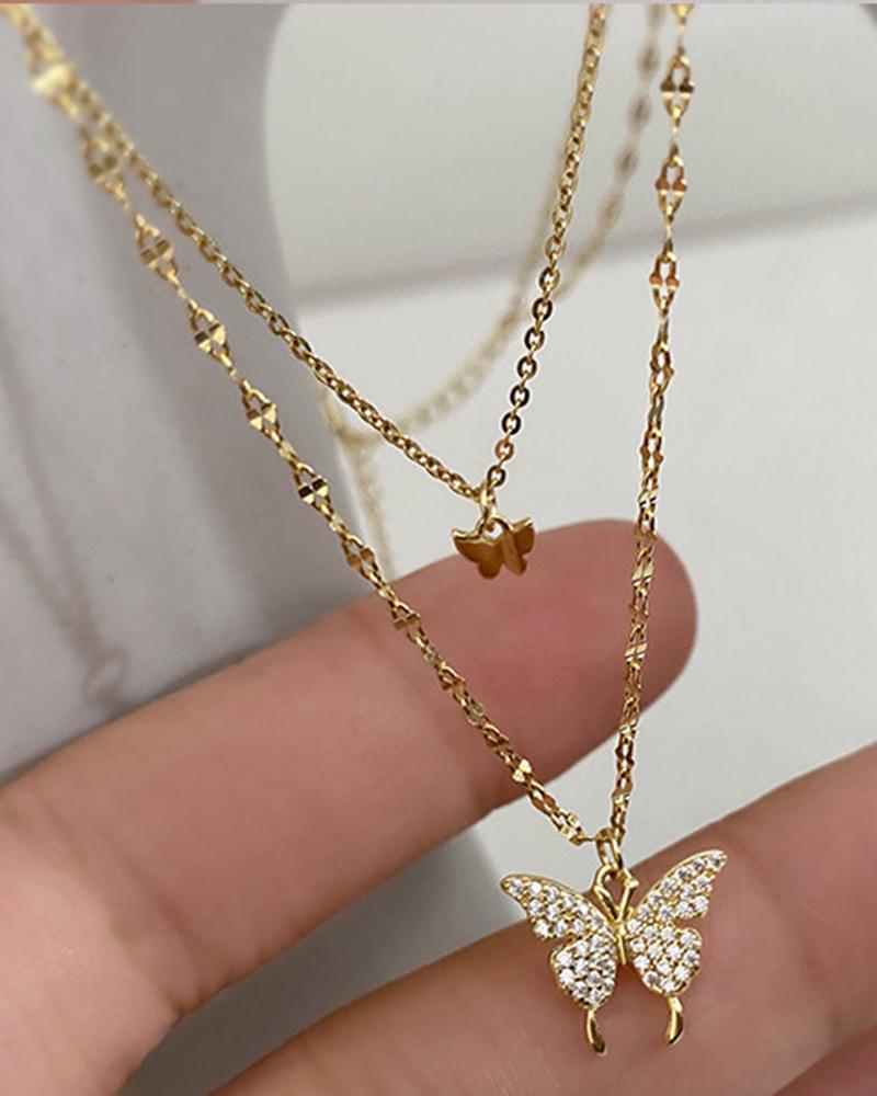 2PCS/Set Multi-Layer Rhinestone Butterfly Pendant Necklaces, Gold