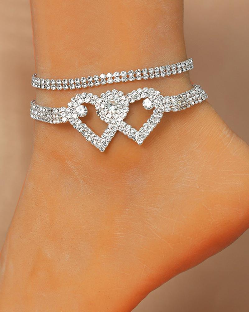 2PCS/Set Rhinestone Double Heart Stackable Anklets, Style2