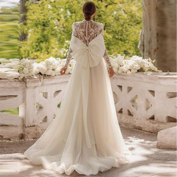 wedding dress a-line classic lace long sleeves high neck bow knot appliques sequins beads plus size sparkling hollow lace ruffles bridal gow, White