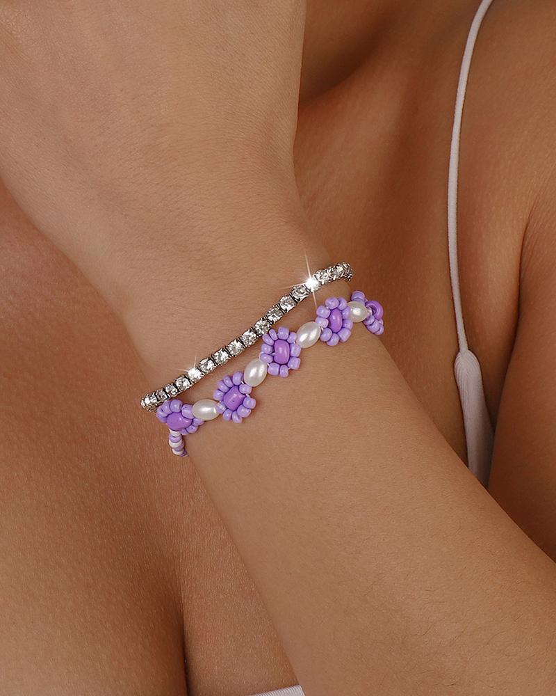 2pcs Beaded Rhinestone Floral Pattern Bohemian Bracelet, Purple